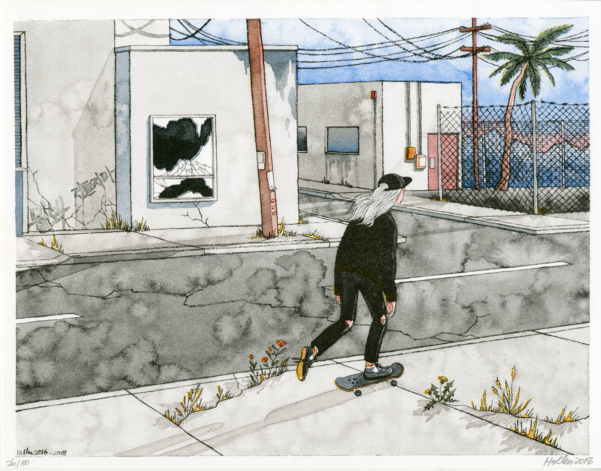 Hellen Jo is an illustrator and cartoonist living in Los Angeles, California. Her work, which includes watercolor paintings, comics, zines, and casual apparel, consists primarily of sullen and intimidating Asian American teenaged girls frightening the locals and disrespecting authority.